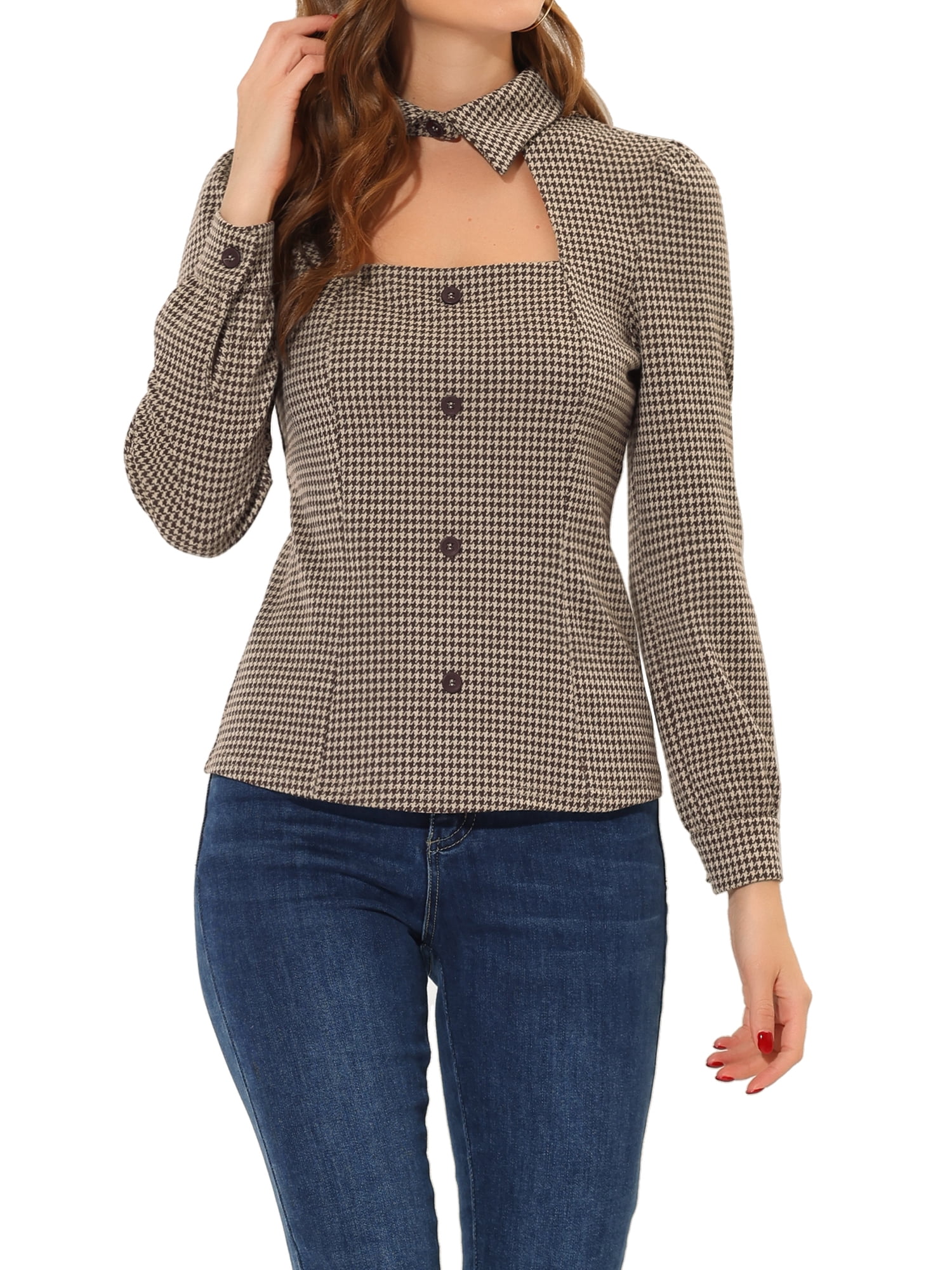Allegra K Women Houndstooth Print Choker Neck Puff Long Sleeve Elegant Casual Blouse Top Walmart Com