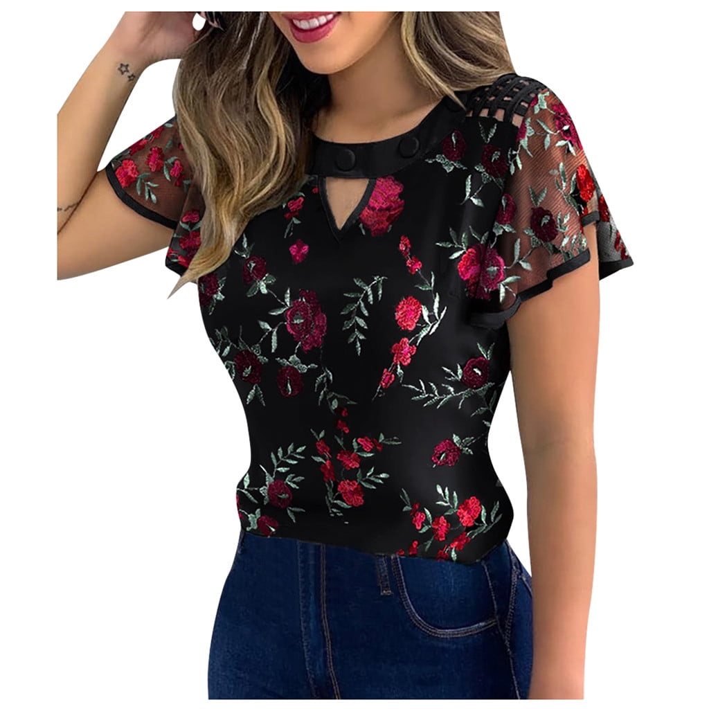 Scyoekwg Summer Short Sleeve Shirts For Women Choker Neck Perspective Dot Mesh Sleeve Blouse Lightweight Loose Comfy Soft Shirts Tops Floral Printed Casual Graphic Tee Trendy Black S Walmart Com